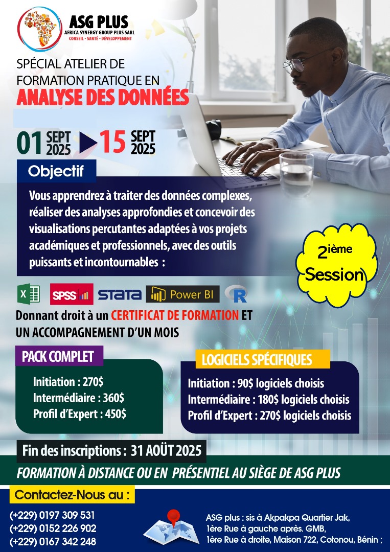 Les compétences à acquérir à l’issu de cette formation sont fortement demandées dans des domaines variés du marché du travail. Au cas d’espèce, la maitrise des logiciels comme Excel avancé, STATA et R est indispensable dans la production des rapports d’enquêtes au sein du Cabinet ASG Plus. Par ailleurs, ces logiciels sont incontournables dans le secteur privé étant donné leur utilité dans le suivi et la prévision des ventes et du chiffre d’affaires. Le secteur public n’est pas en reste, étant donné l’importance de la maitrise de ces logiciels pour le suivi-évaluation des projets, ainsi que pour la recherche et les études démographiques.